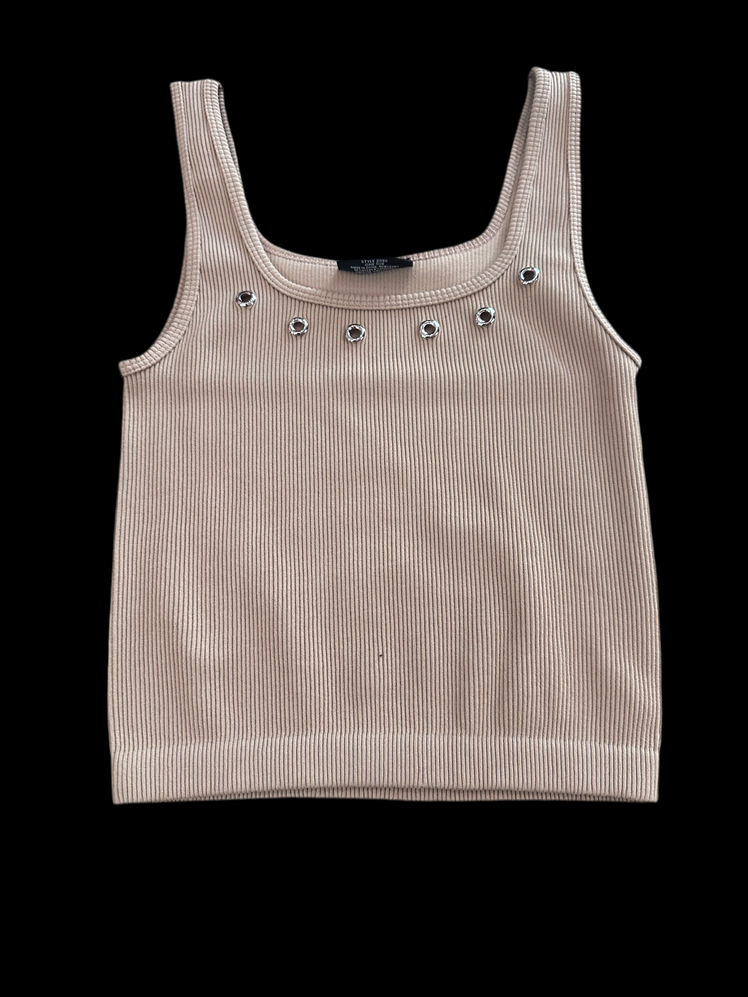 Upgrade your wardrobe with our Basic Grommet Detail Tank Top! The ribbed material and grommet detail add a touch of edginess to any outfit, while the one size fits all and nude color make it a versatile piece for any occasion. Elevate your style with this must-have tank top.