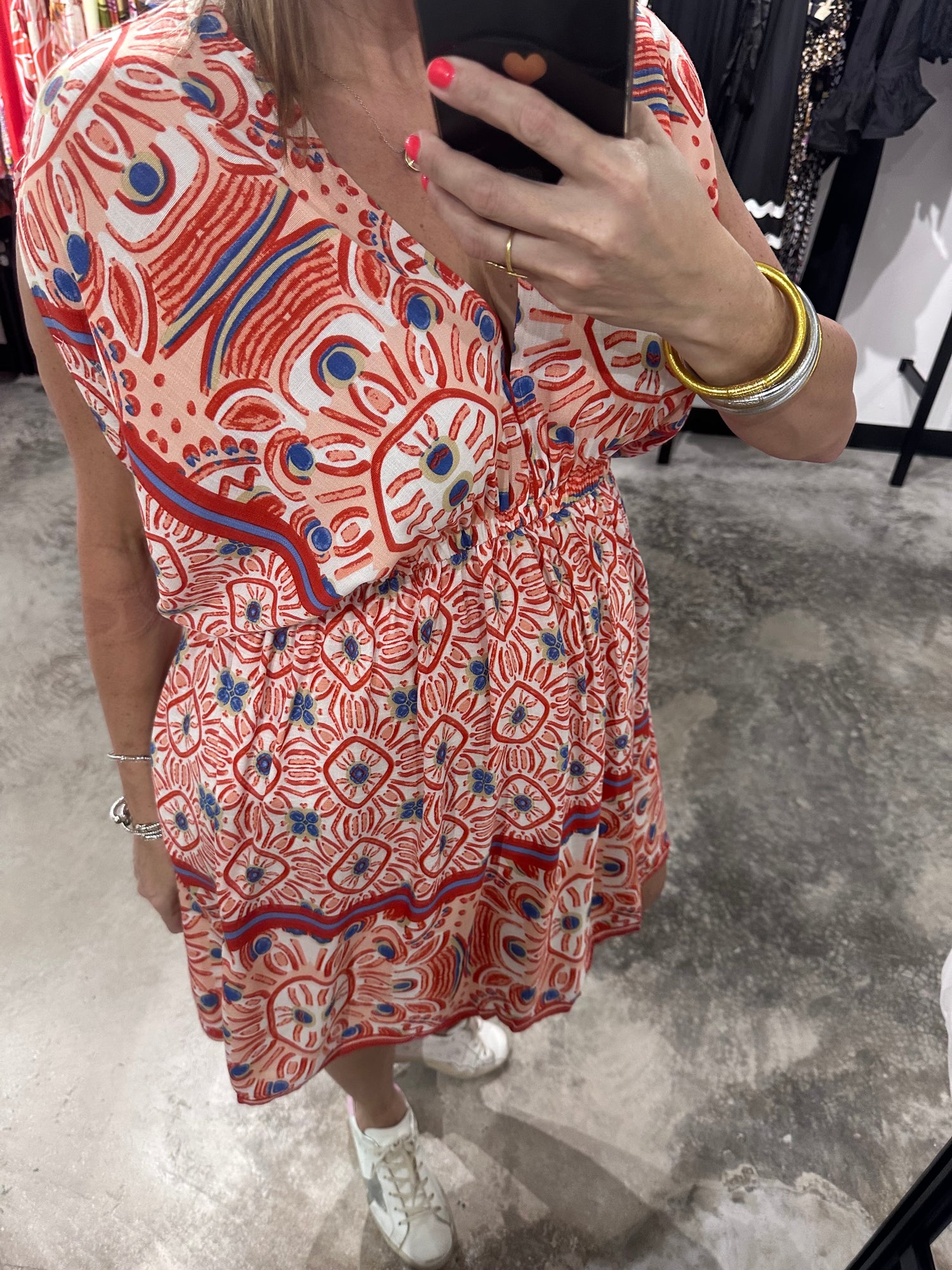 Step into boho chic elegance with this vibrant Boho Cic Short Dress. Featuring a printed V-neck and flowy kimono-style sleeves, it offers a breezy silhouette complemented by an elastic waist for a perfect fit. Made from 100% rayon, the red multi pattern adds a playful yet stylish touch, making it an ideal choice for sunny days or casual outings. Elevate your wardrobe with a dress that seamlessly blends comfort and flair.
