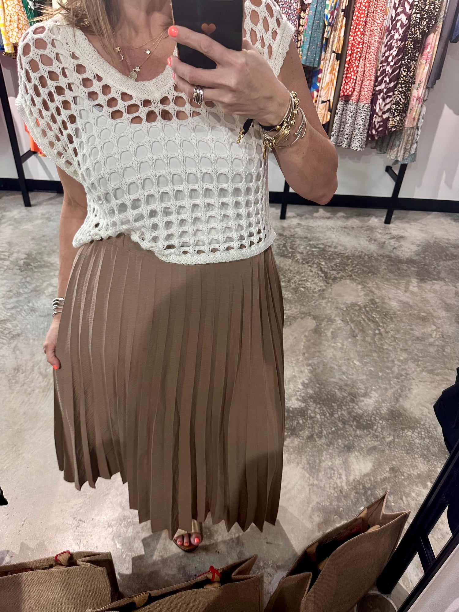 Indulge in the effortless elegance of our Coco Pleated Midi Skirt. Crafted with 100% polyester, this midi skirt features a flattering pleated construction and elastic waist, providing both comfort and style. The versatile coco color adds a touch of sophistication to any outfit. Elevate your wardrobe with this must-have piece!