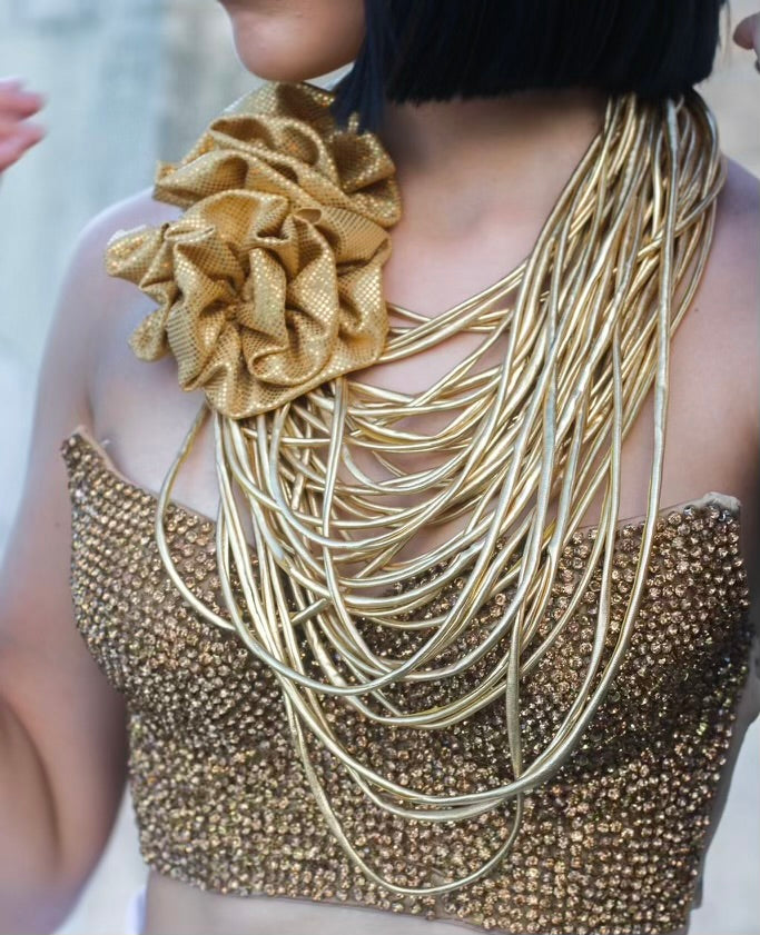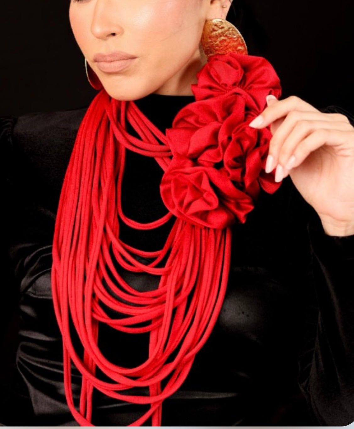 Add a touch of elegance to any outfit with our local designer's Necklaces - Pick your color Metallic Silver, Gold , Red or Black Palme Layer Necklace. The delicate flower detail and unique design make this necklace a standout piece. Tie it on your neck for a flawless look.