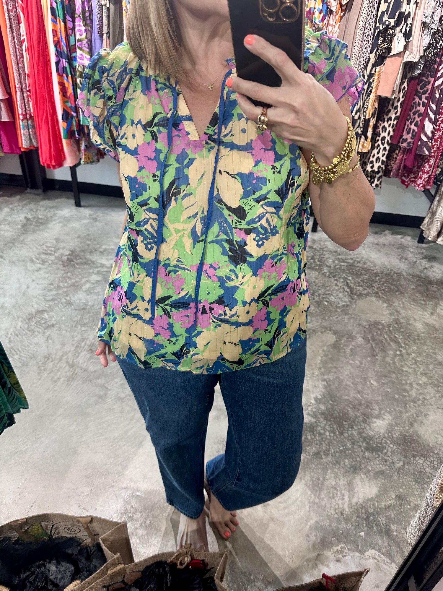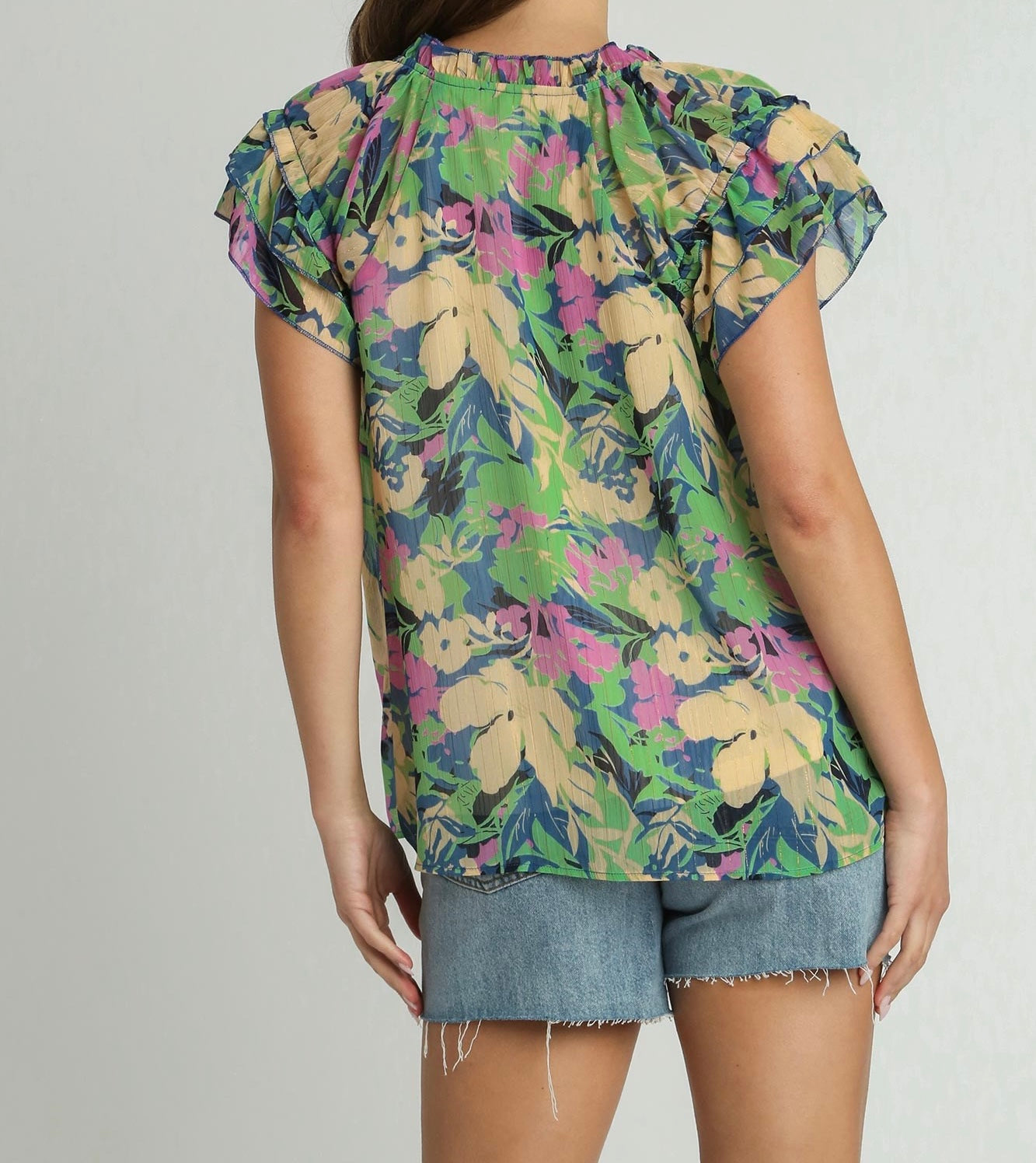 Elevate your wardrobe with our Metallic Lurex Floral Top! This stunning piece features a vibrant floral print with a touch of metallic shine. The front tie adds a trendy twist, while the layered sleeves and lining offer comfort and style. Made of a durable polyester and metallic blend, in a beautiful blue mix.