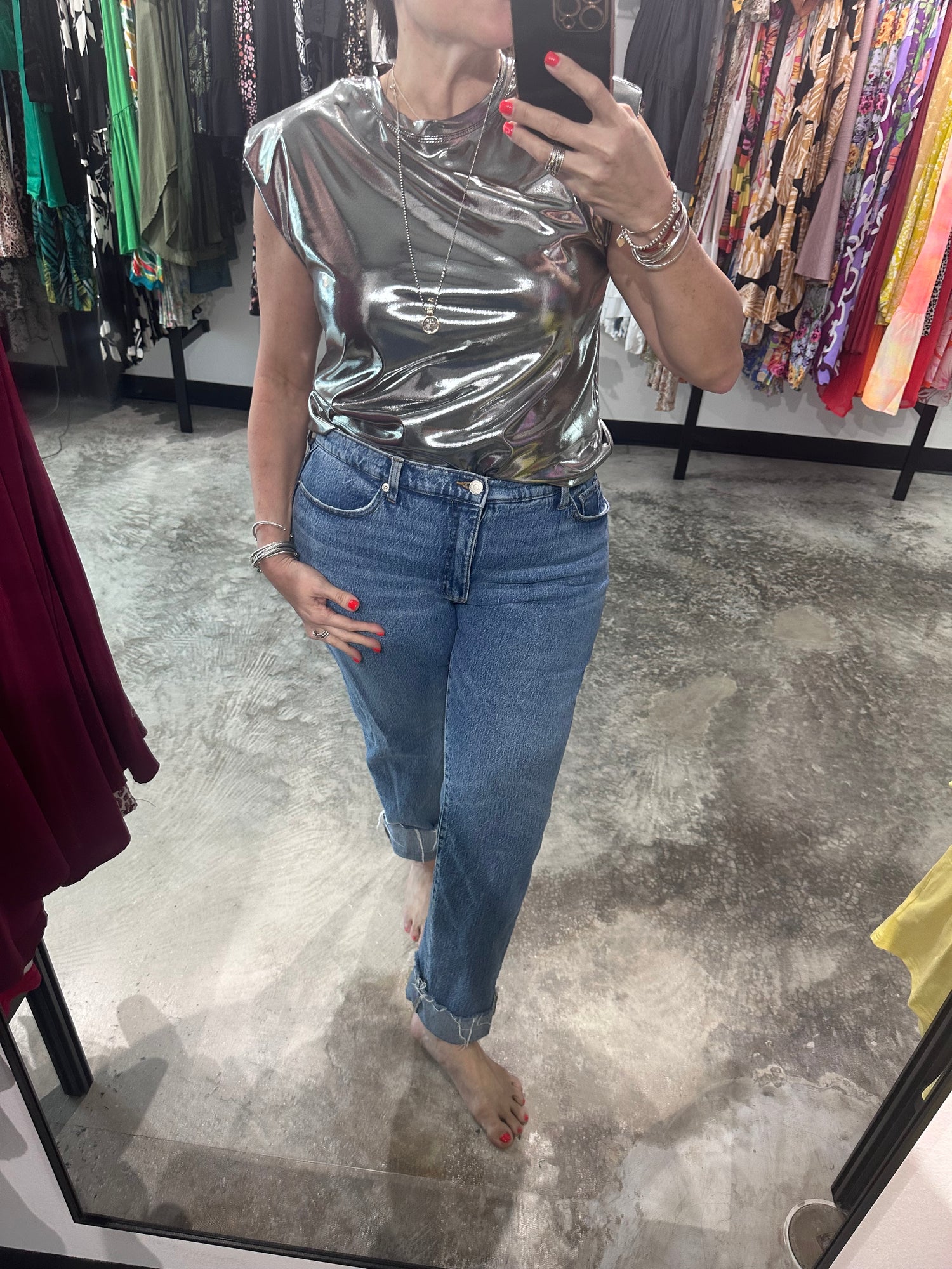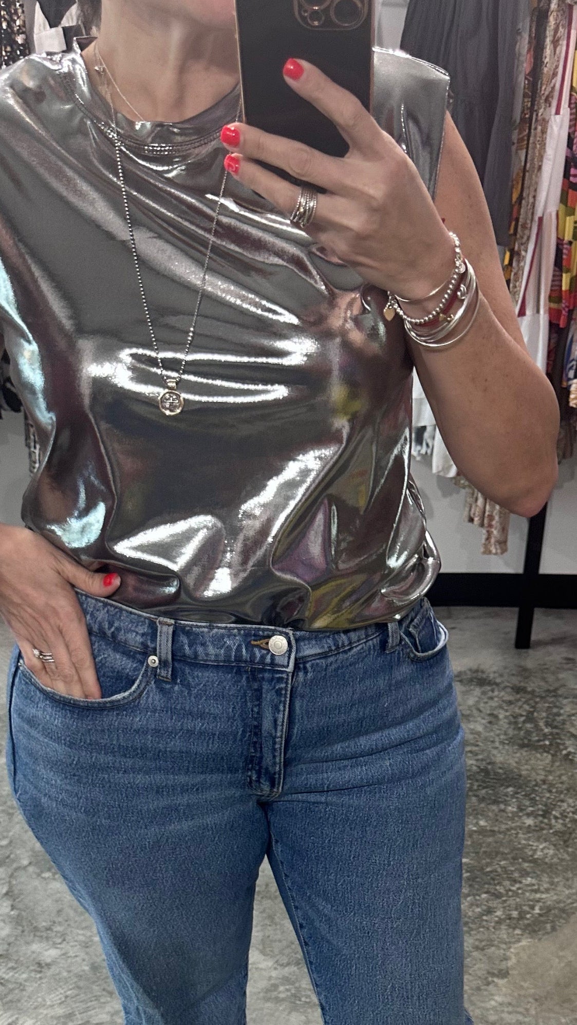 Elevate your style with our Metallic Silver Top! This shimmery top features a round neck and is made with 82% polyester and 18% spandex for ultimate comfort. The metallic detailing adds a touch of glamour to any outfit. Plus, it runs true to size for a perfect fit. Upgrade your wardrobe now!