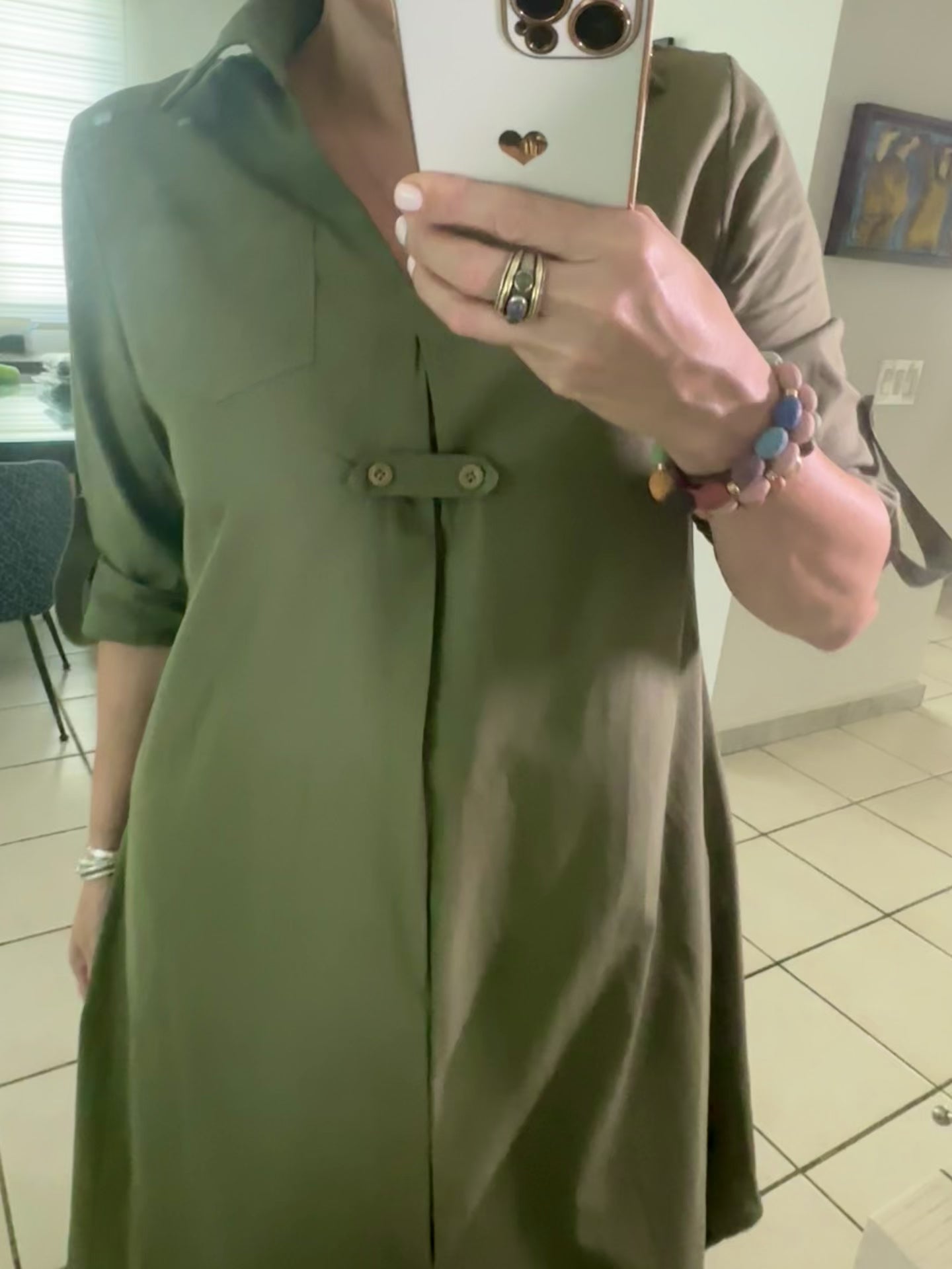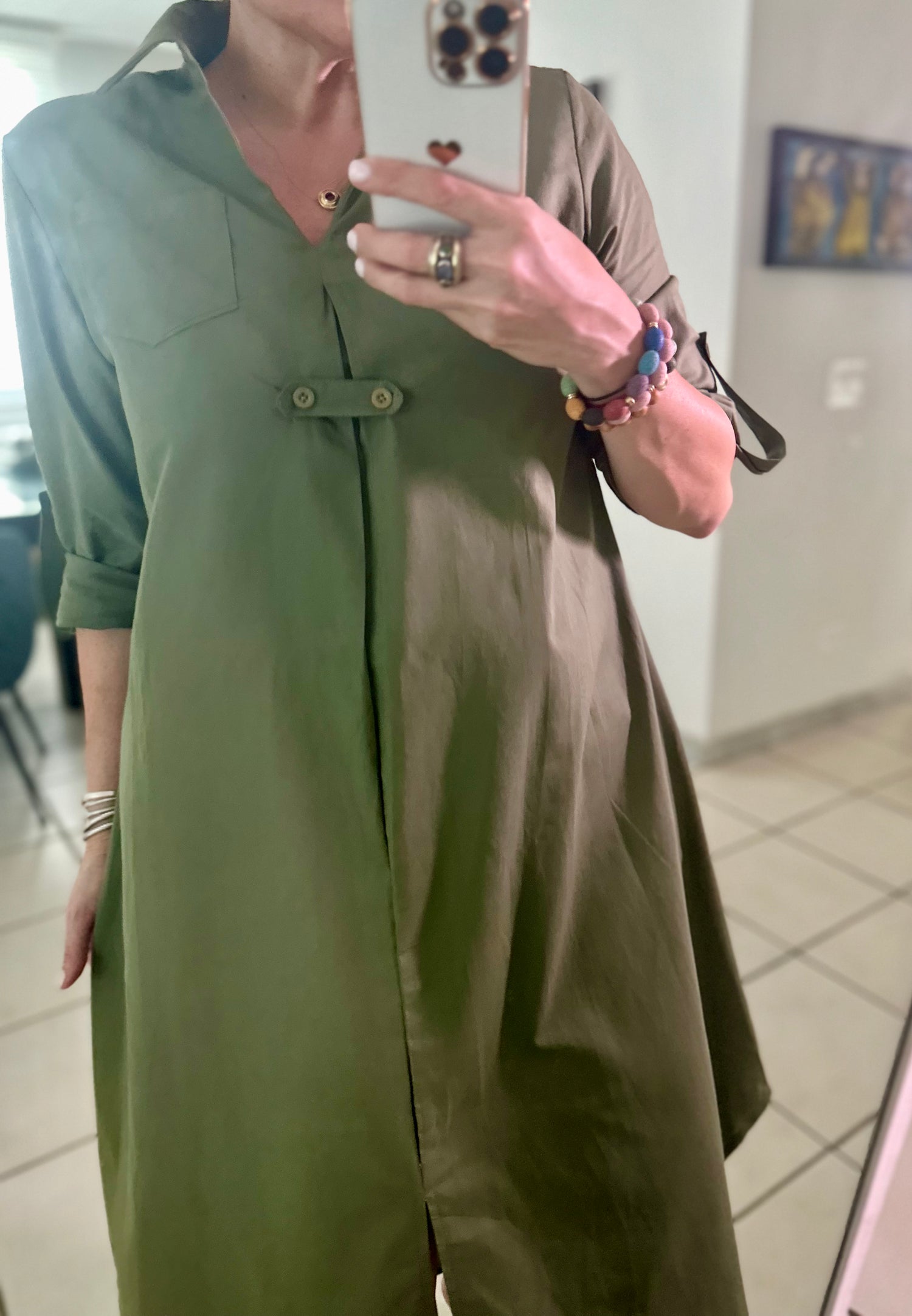 Get ready to turn heads in this Military Green Long Sleeve Midi Dress! The flattering V neck and casual midi length make this dress perfect for any casual occasion. Made from 100% cotton, it's comfortable and stylish. Order now to secure your piece of this must-have dress!