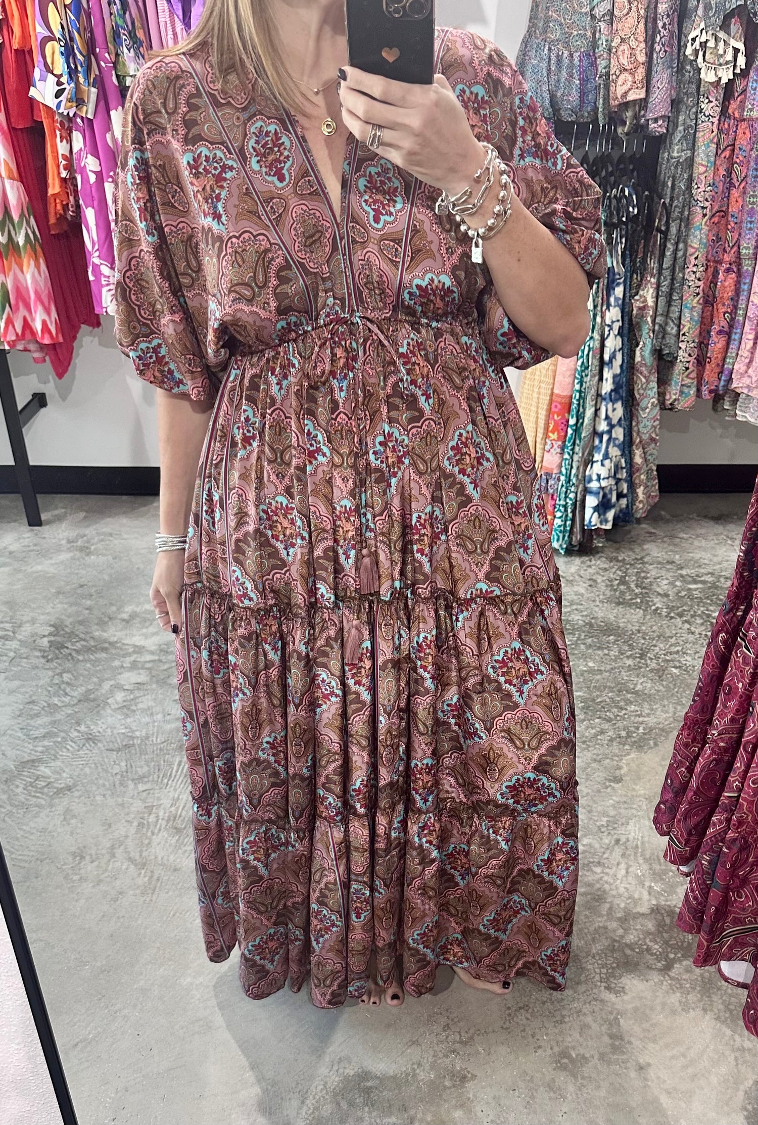 This elegant maxi dress features 3/4 sleeves and a flattering tiered design that flows beautifully. Its elastic, adjustable waist ensures a perfect fit for all body shapes, combining comfort with style. Ideal for any occasion, this versatile one-size dress offers effortless sophistication and timeless charm.