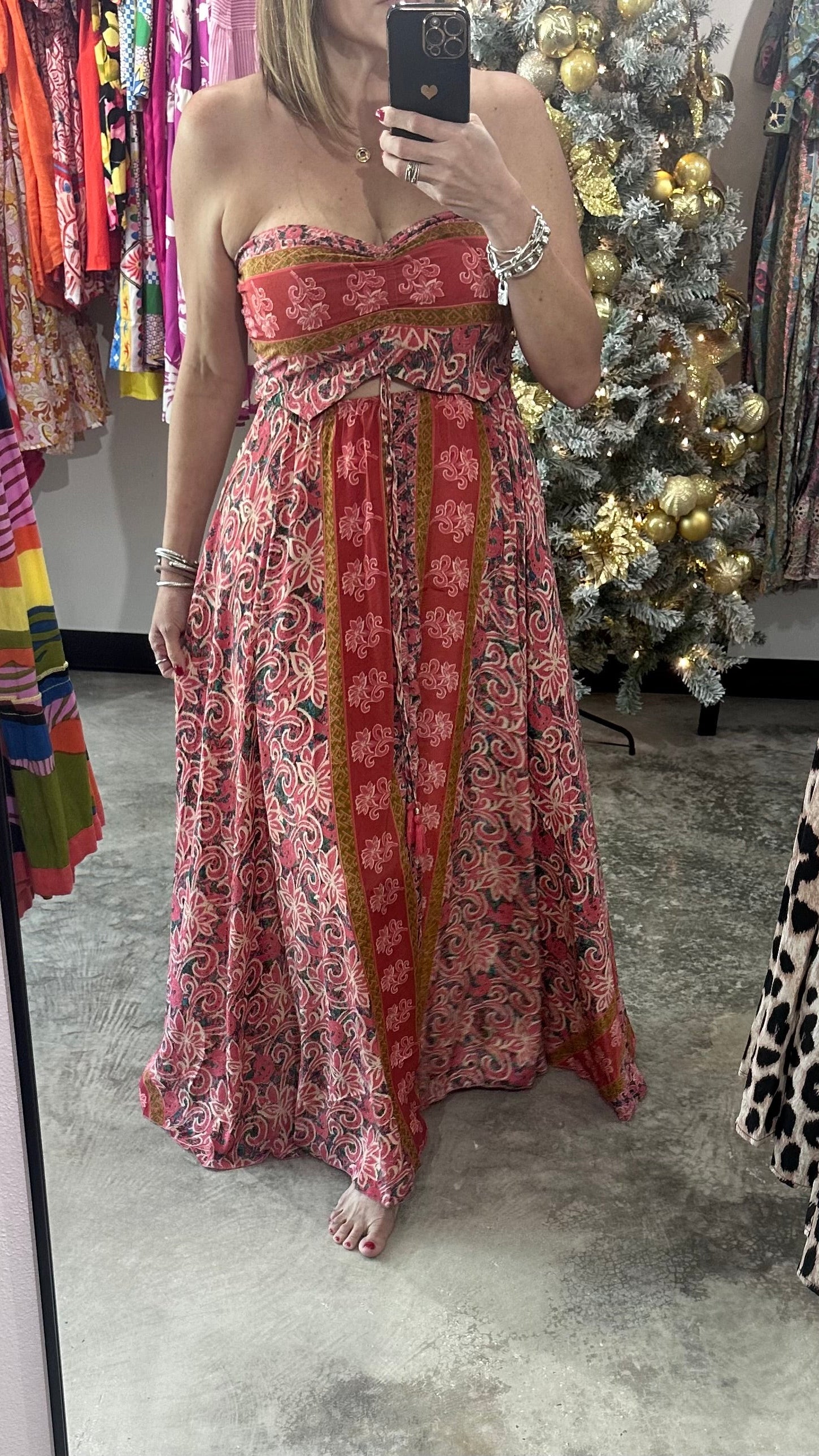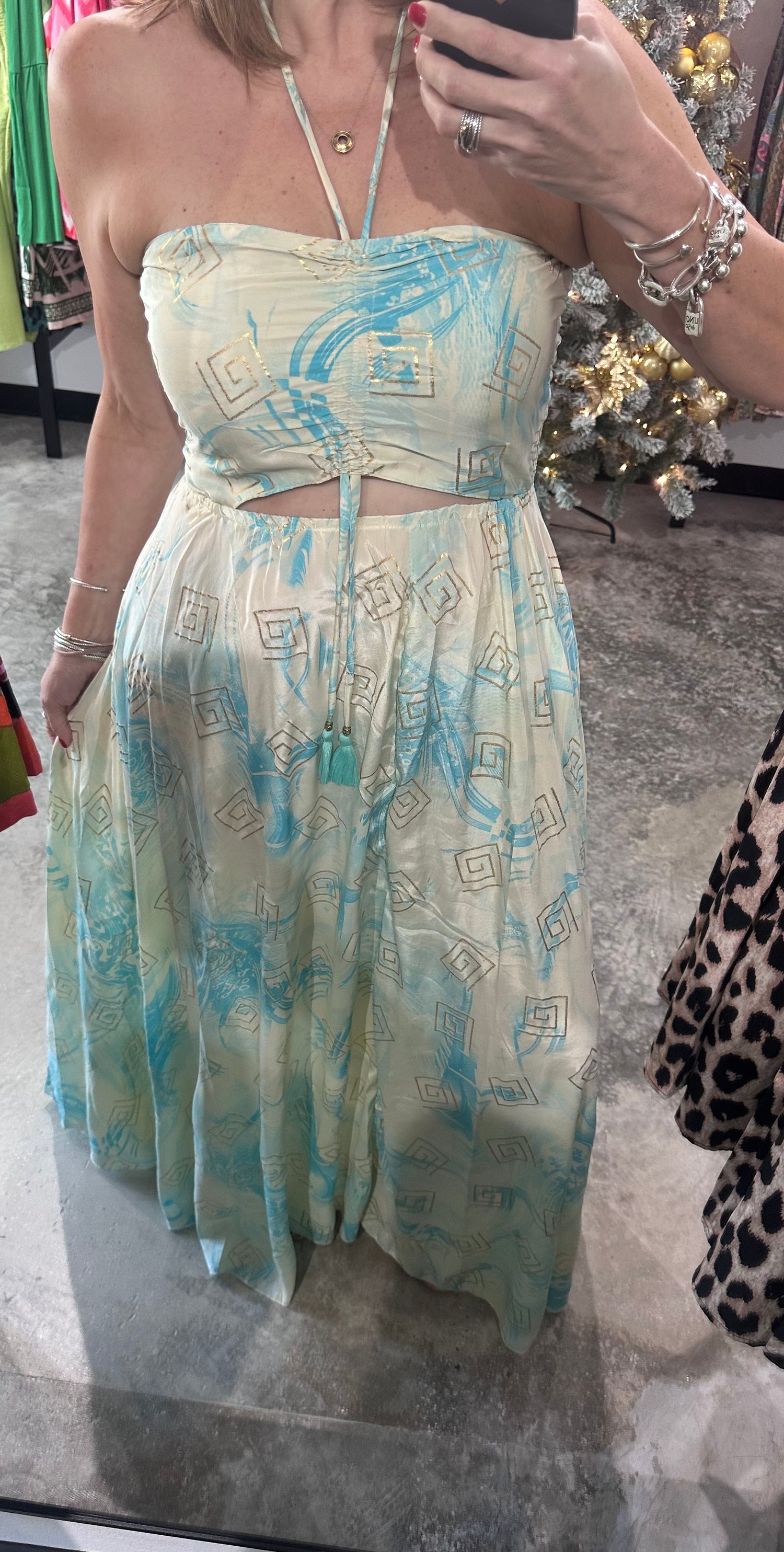 Transform your evening look with this stunning strapless maxi dress that offers endless styling possibilities. The strategic cut-out design showcases your silhouette while the intricate smocked detailing on the back adds an unexpected touch of elegance. Wear it strapless for a bold, sophisticated statement or convert it to a halter neckline for enhanced comfort and security. One versatile size accommodates most figures, making this the ultimate investment piece for any special occasion or upscale event.