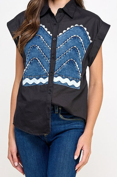 This Black Denim Color Block Top offers a fresh take on classic style with its bold color blocking and button-down design. Made from 100% cotton, it ensures comfort and breathability, while the short sleeves make it perfect for warmer days. Its versatile black denim fabric pairs effortlessly with any look, making it a standout addition to your wardrobe. Order now to add this stylish essential to your collection.
