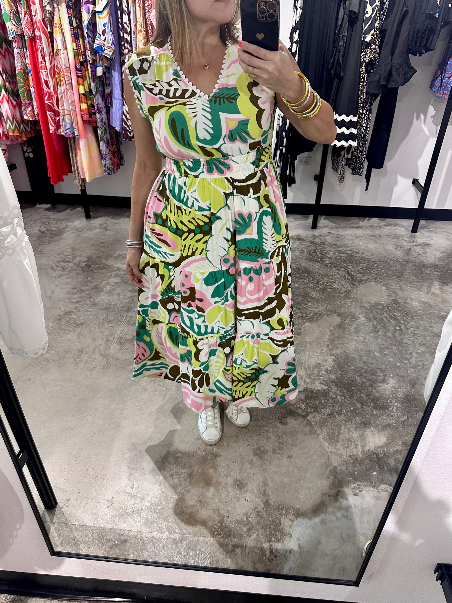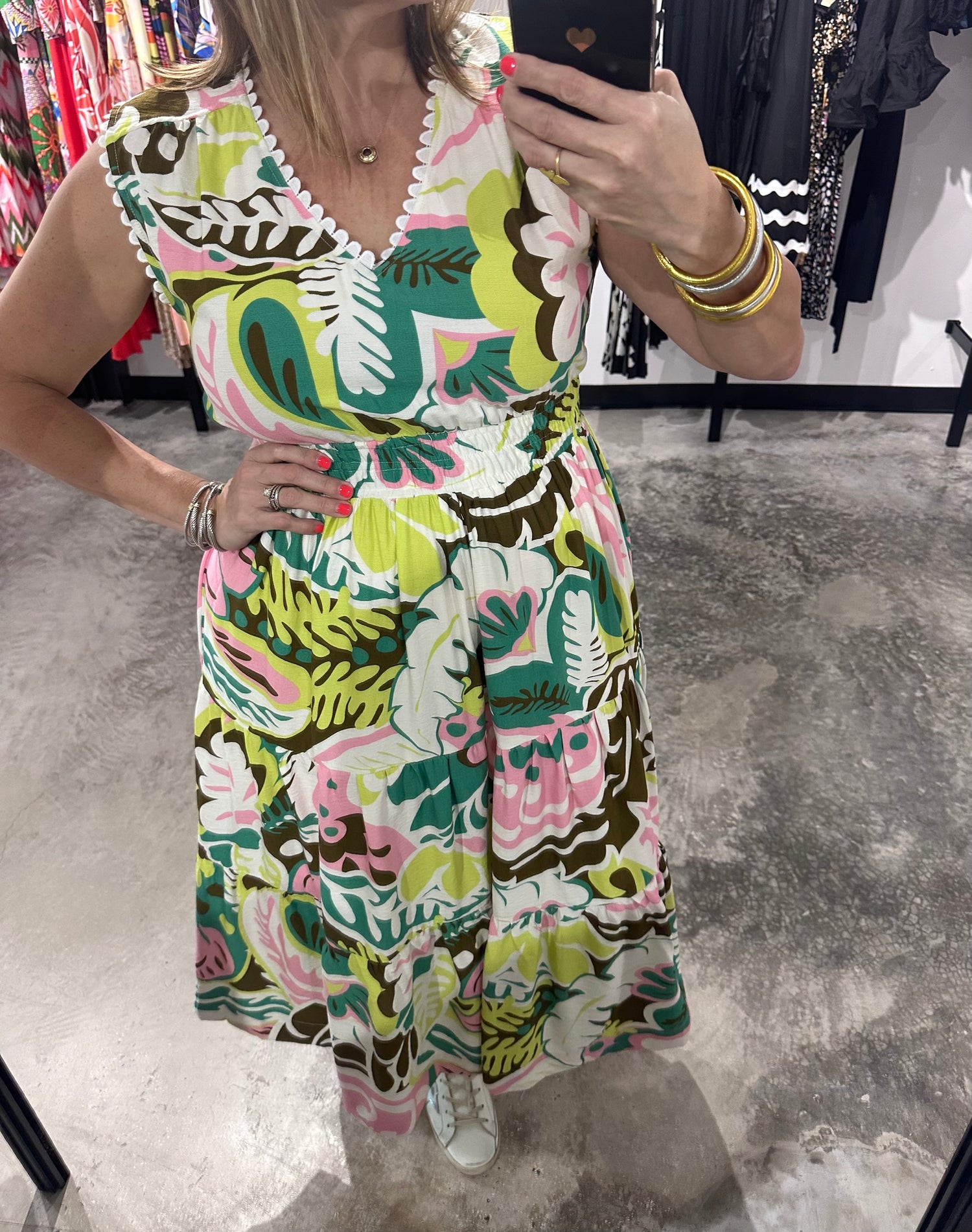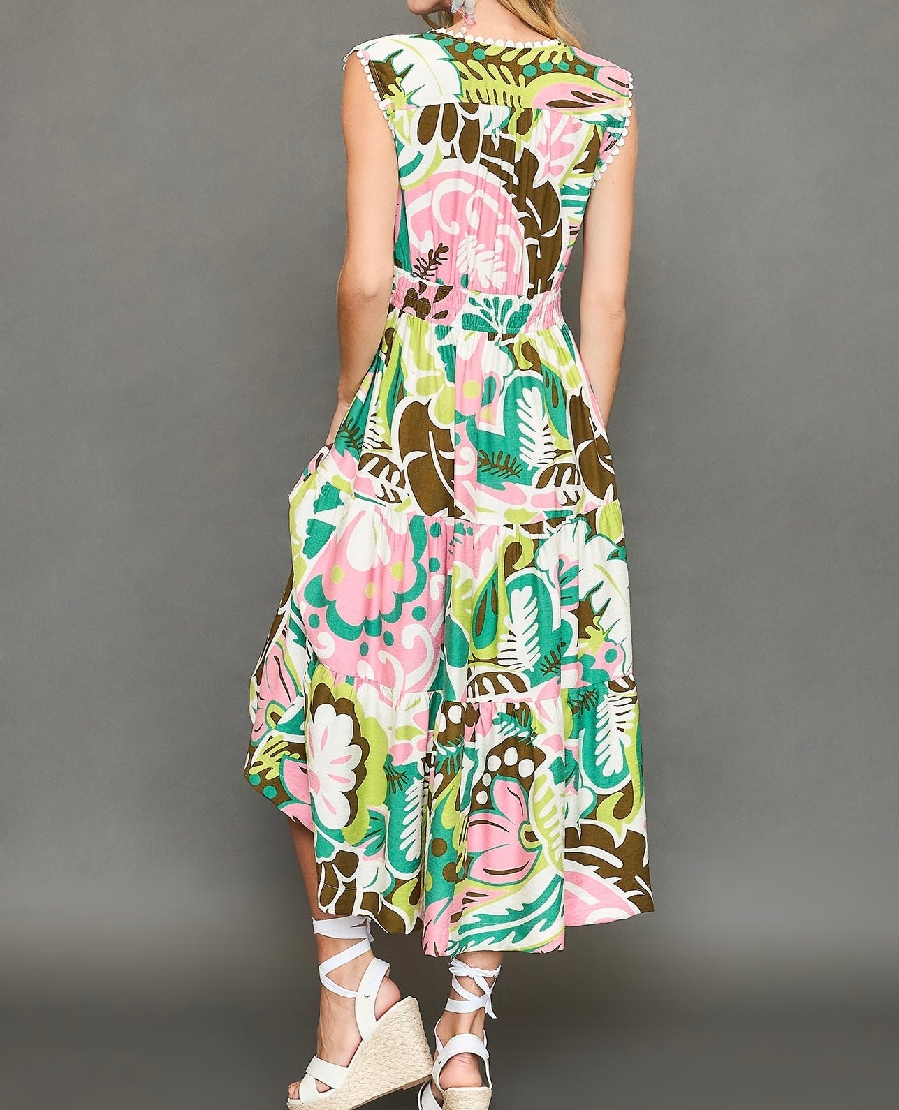 This sleeveless print midi dress features a flattering V neckline and a tiered skirt that adds movement and charm. The green mix pattern brings a fresh, vibrant look, while the smocked detail on the back ensures a comfortable, tailored fit. Perfect for warm days, this dress combines style and ease effortlessly. Order now to elevate your wardrobe with this versatile, eye-catching piece.