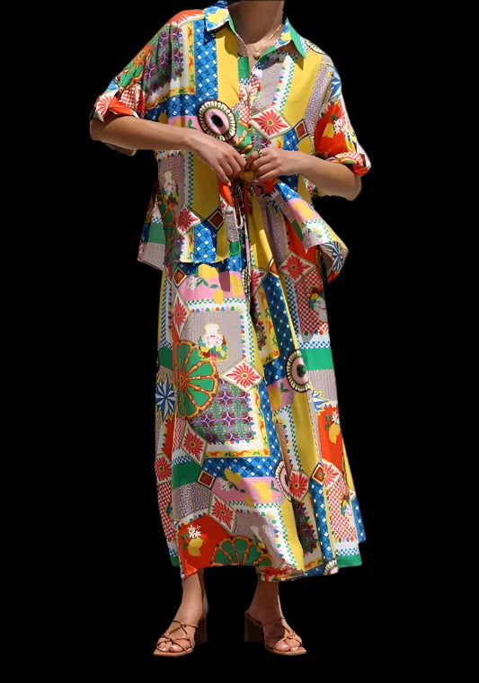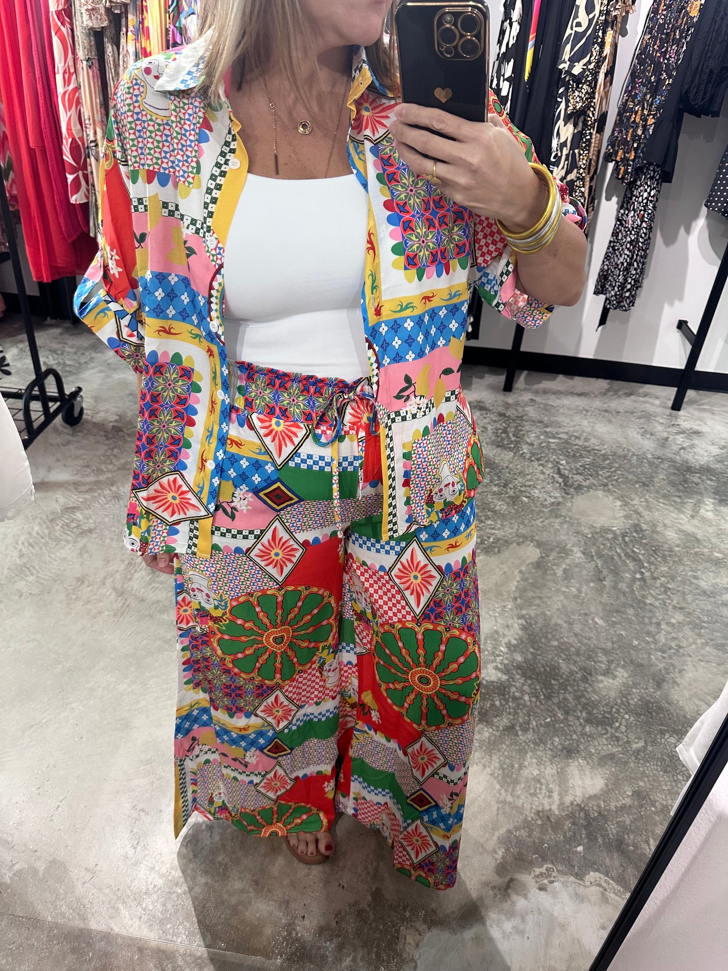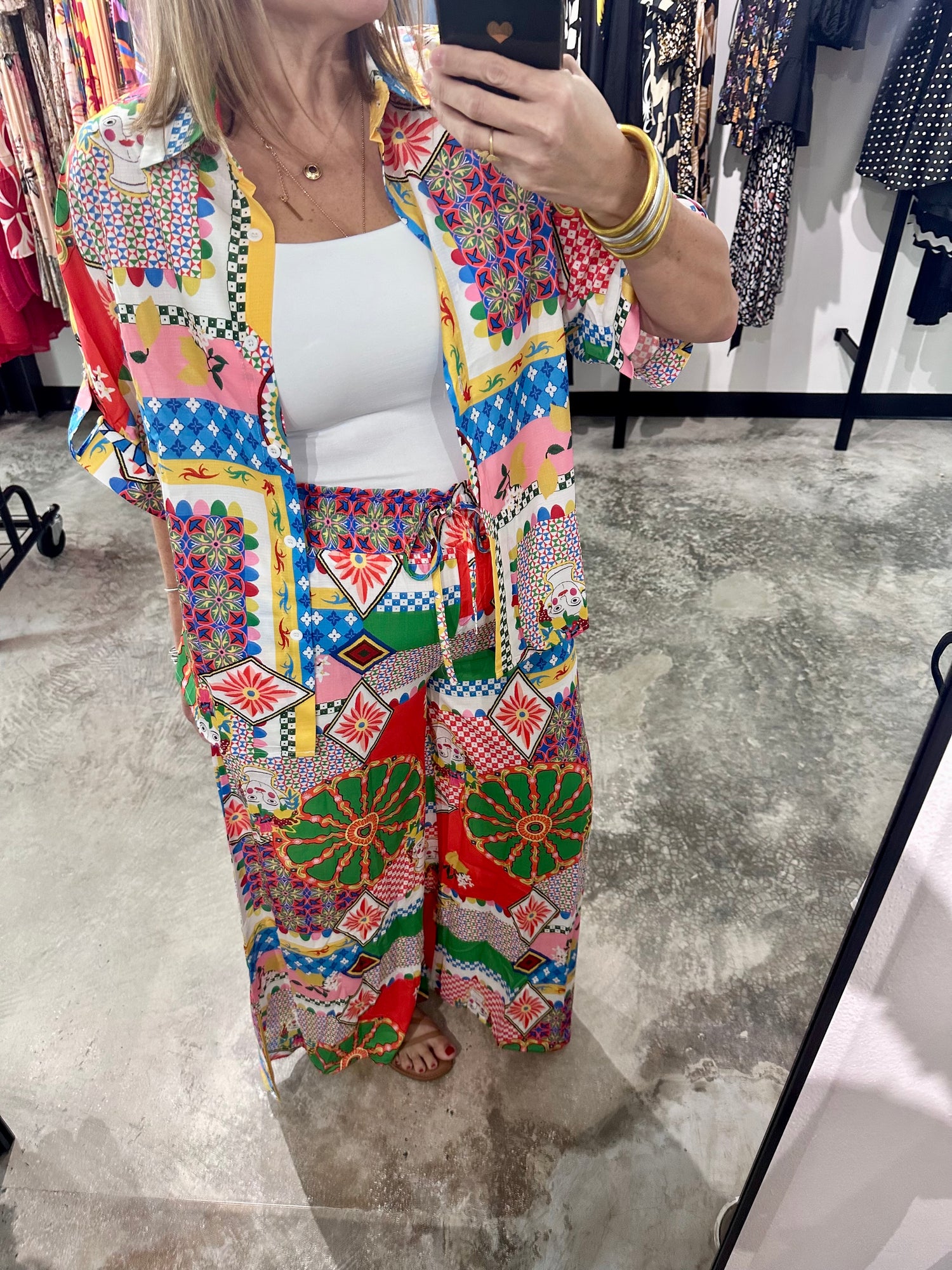 Elevate your wardrobe with this vibrant short sleeve matching set featuring a multi-color print. The button-down shirt pairs effortlessly with wide-leg pants, offering a stylish and comfortable look perfect for any occasion. Order now to secure this eye-catching ensemble that blends bold design with relaxed fit.