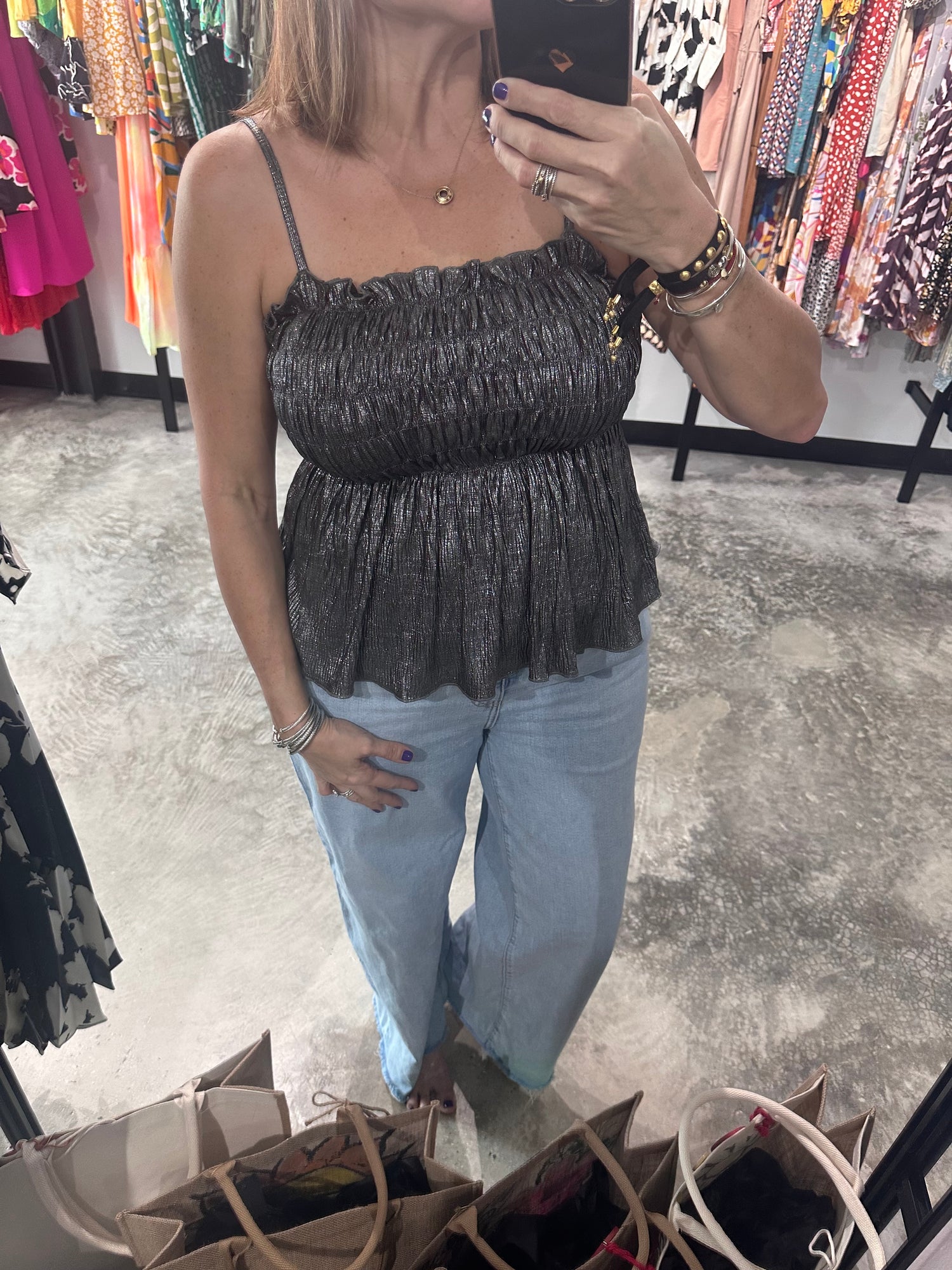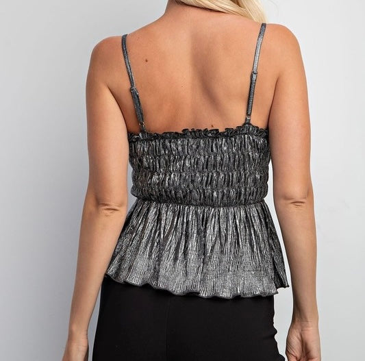 Indulge in luxury with our Silver Smocked Lurex Top! The spaghetti strap design is both stylish and comfortable. The smocked texture adds a touch of elegance while the Lurex material brings a subtle shimmer. Made of 95% polyester and 5% spandex for a perfect fit. Feel glamorous in Silver!