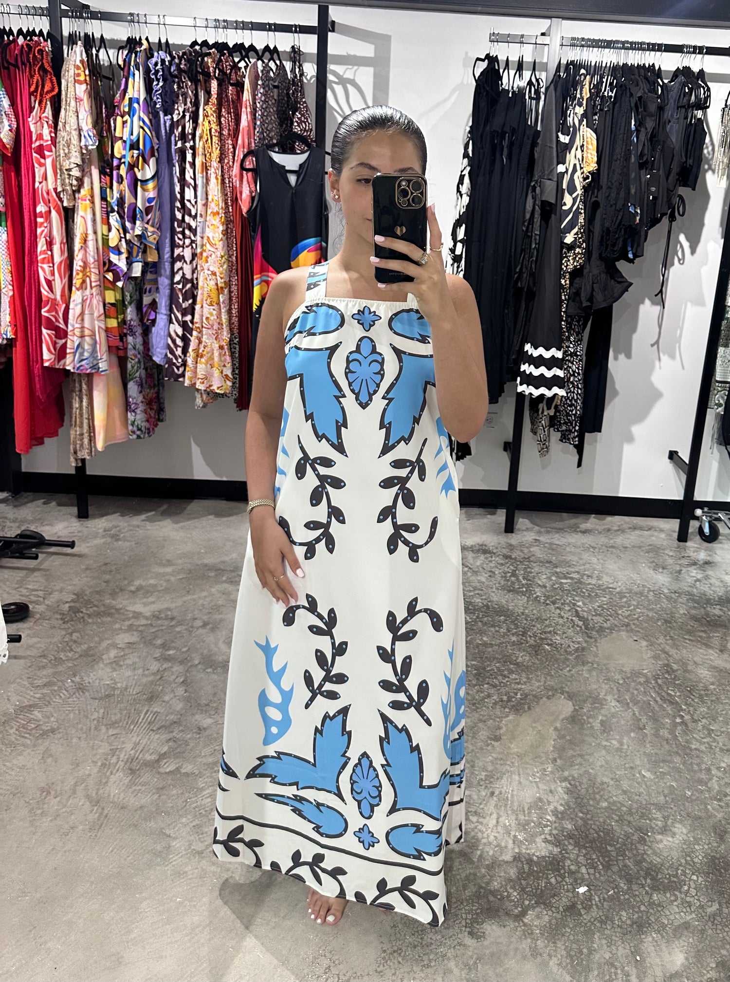 This sleeveless strap maxi dress in a stunning blue shade features a chic square neckline and practical side pockets. Its flowing design offers both comfort and style, making it an ideal choice for any occasion. Elevate your wardrobe with this versatile dress that effortlessly combines elegance and functionality.