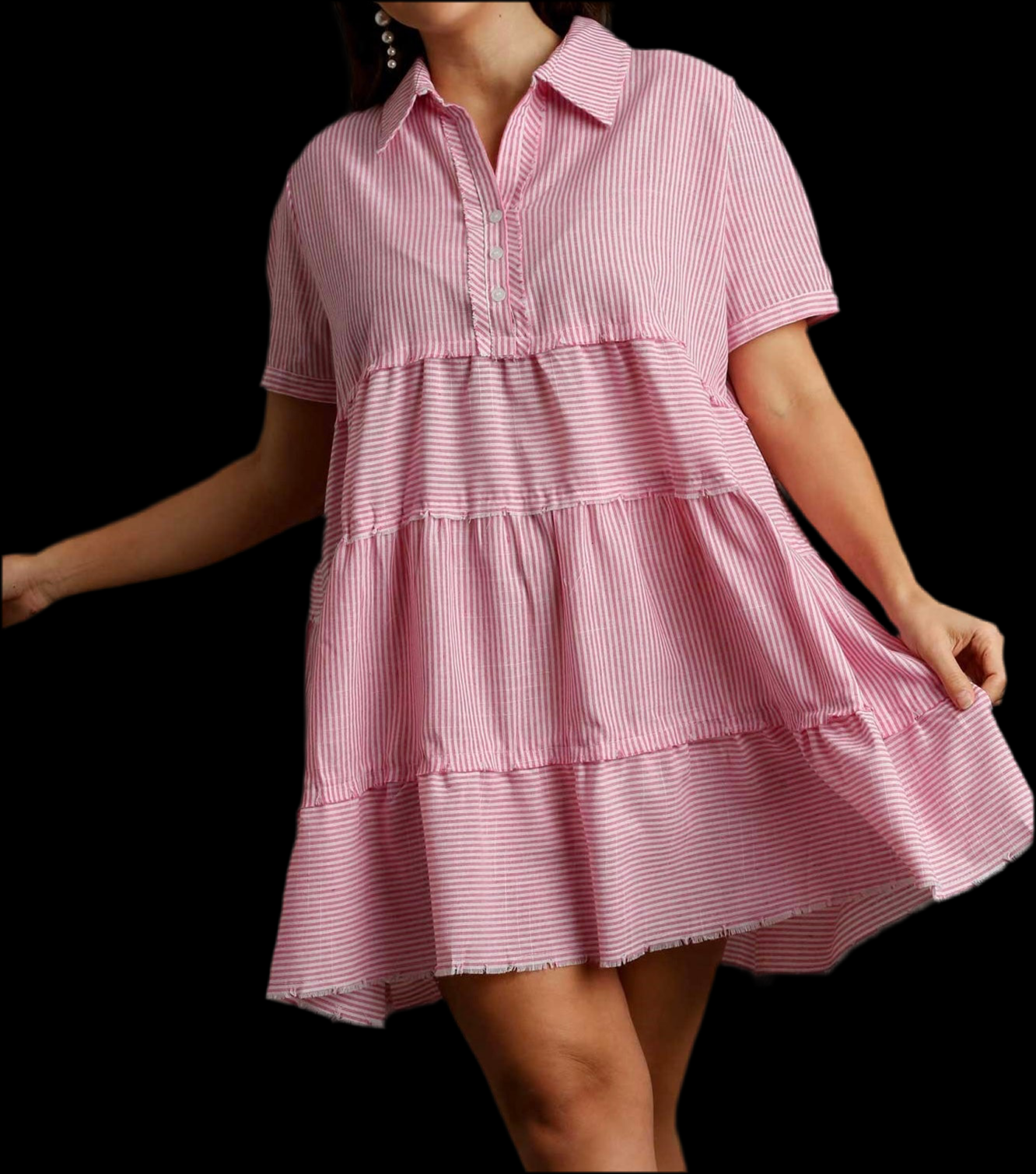 This curvy striped button-up short dress blends comfort and style with its soft 55% cotton and 45% polyester fabric. The flattering pink mix pattern enhances your silhouette, while the button-up design adds a chic, versatile touch perfect for any occasion. Embrace effortless elegance and confidence in this must-have wardrobe staple.